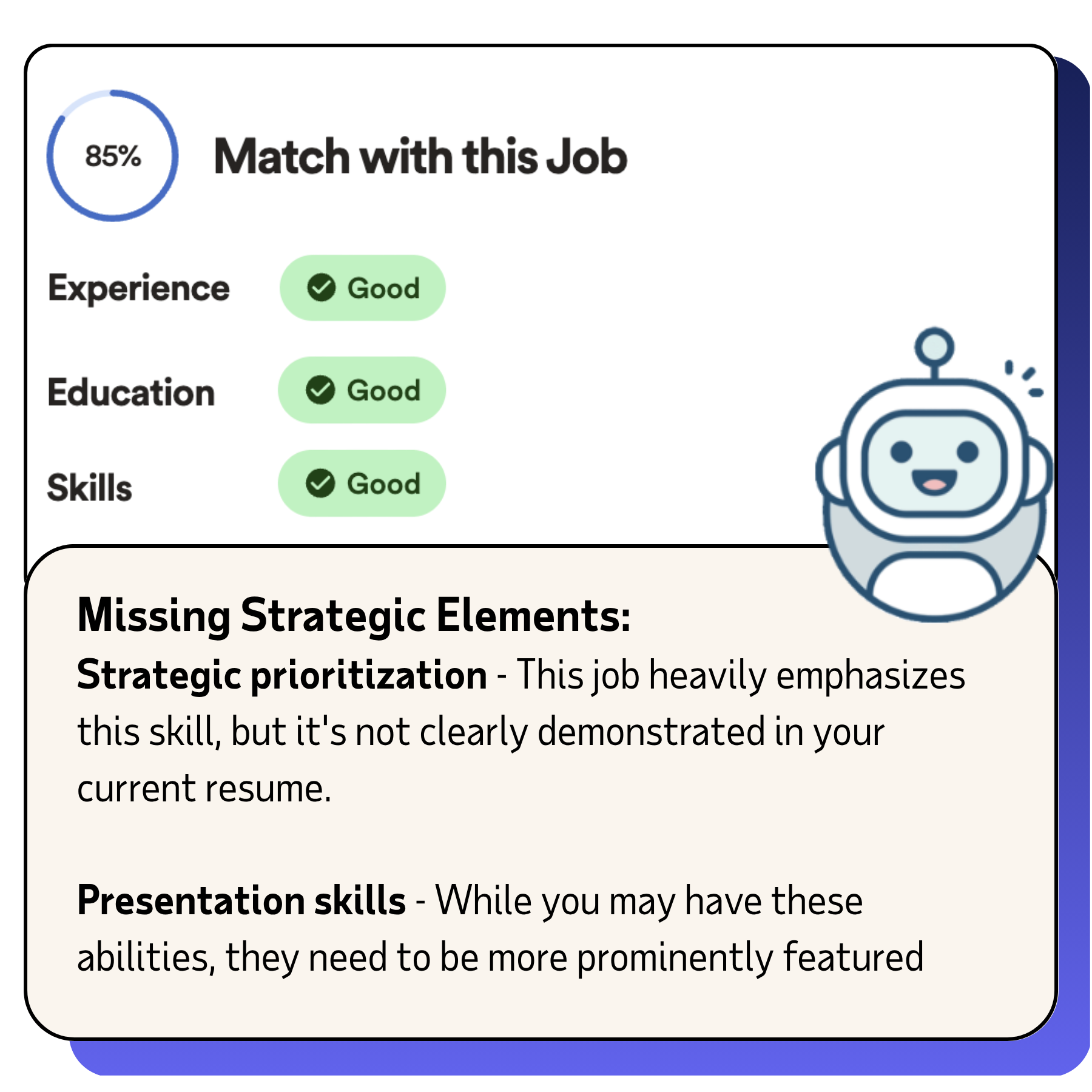 See how well your resume matches each job opportunity with our advanced resume scanner and ATS scanner technology. Our intelligent system analyzes your resume against specific job descriptions, identifies the best keywords for a resume in your field, and shows you which keywords recommended to put on your resume. Get actionable feedback to improve your ATS compatibility and keyword optimization.